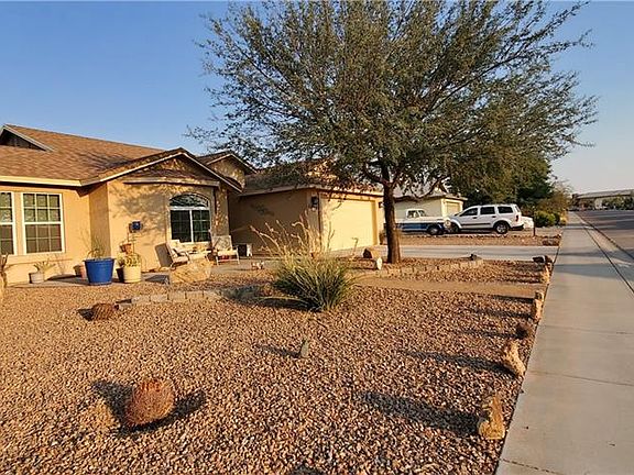 BEAUTIFULLY CARED FOR INSIDE AND OUT!! This 3BR, 2BA, 1,463 sq. ft. home with a finished attached garage has been well loved and cared for by one owner. The interior of the home is light and airy, picture perfect with an open concept split floor plan, cozing living room with built in entertainment center, large country kitchen with gas stove, built in microwave, refrigerator, beautiful oak cabinetry, pull out shelves, pantry, breakfast bar and lots of counter space. Casual dining off of the kitchen with a slider door to the rear patio. The spacious master bedroom has a sitting area with a slider leading to the rear patio, big walk in closet and a walk in shower in the master bathroom. Nice size guest bedrooms and closet space and a full guest bathroom. Vaulted ceilings, pots shelves for displaying all your treasures and collectibles, two tone paint and fans throughout. Indoor laundry room with cabinets, washer and dryer to stay. Step outside either slider door to your own paradise in the desert with a covered rear patio to entertain, dine alfresco and just sit unwind and relax. Enjoy the built in BBQ and bar area, soak your cares away in the hot tub while taking in the views of the Hualapai Mountains to the East, enjoy easy care gardening with mature trees and landscaping all irrigated or tinker in the workshop. Block wall around rear yard for privacy, RV gate and RV parking with full hookups on the South side of the home. Beautifully landscaped in front as well with a nice sitting area, perfect for enjoying a cup of coffee in the morning. Don't wait call to schedule your viewing of this fantastic property and get ready to call it home.