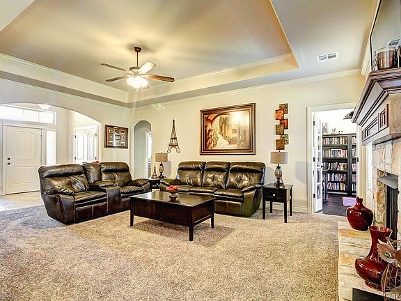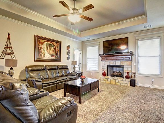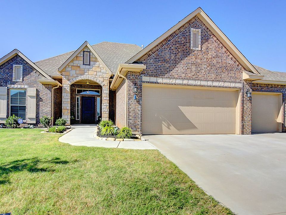 Rare opportunity! Sellers updated with long-term future in mind, but work is sending them in a new direction. Their loss is your gain! Hand scraped hardwood floors welcome you into the great room with a beautiful cast stone gas fireplace and comfortably open dining and kitchen area. Kitchen granite counters are complimented with new SS Bosch appliances, dbl pantry storage and custom center island wine fridge. Upstairs is complete with full bathroom and closet. Master bath suite is truly a place to pamper with large jetted tub, separate granite vanities and huge walk around shower. Wood pediments at doors and windows, crown molding and 5"trim add the finishing touch to this classy home. Customized backyard includes 6 zone sprinkler system for newly planted trees and plants, extended flagstone stamped and stained patio as well as hard wired focal lighting. Pool and clubhouse coming soon! Just a few miles to OU and direct highway access, this neighborhood is a standout!