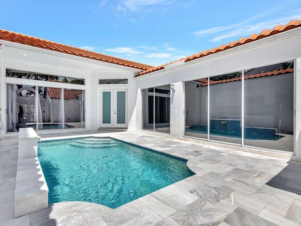 Courtesy of Compass Florida LLC Enjoy a private, stylish, and low-maintenance lifestyle in this beautifully updated 3BR/2BA villa with pool in the gated Boca Country Club. This single-story home features a luxurious private courtyard with a saltwater pool and theme lightingperfect for peaceful mornings or relaxing dinner alfresco. Inside, the villa is filled with natural light and thoughtfully designed finishes. Porcelain tile flooring and multiple sliding glass doors create a seamless connection between the main living areas and the courtyard retreat. The updated kitchen boasts quartzite countertops, new stainless steel appliances, & recessed lighting. The spacious primary suite offers wood flooring dual vanities, a jetted Roman tub, separate shower with rain and body jets. Two additional bedrooms provide