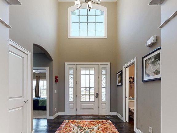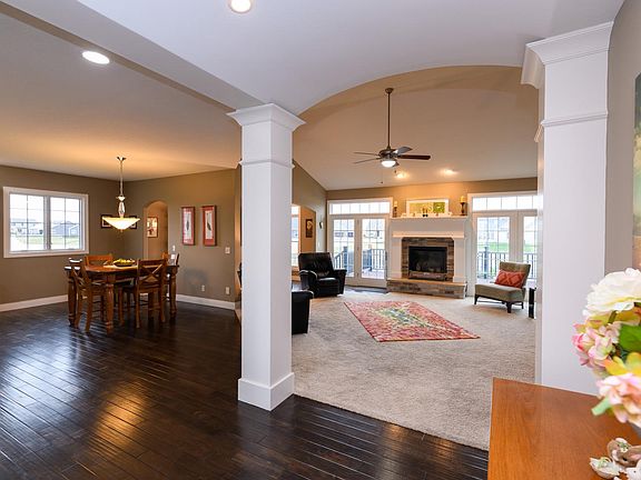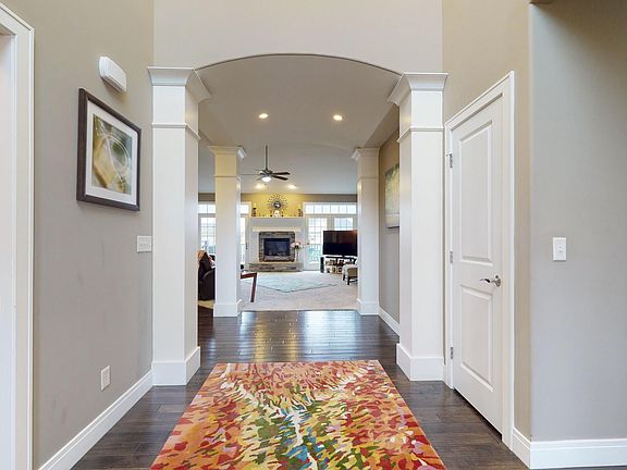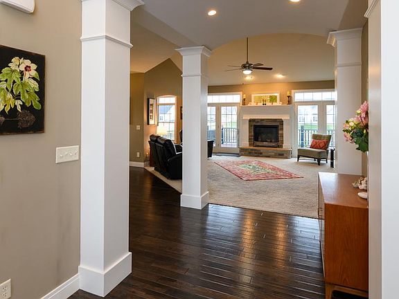 This home boasts an exceptional location, overlooking a park in the front and peaceful lake views from the back! It's corner lot location also enhances curb appeal with a side-load 3-car garage with oversize overhead doors. A premium 8-foot Pella front door opens into a two-story foyer with spectacular natural light. A barrel vaulted entry corridor, complemented by four ornamental columns, leads to the wide-open living space. The great room features cathedral ceiling and a stone fireplace flanked by full-length glass doors on either side, leading to the low maintenance composite deck with lake views. Rich hand-scraped style hardwood floors run from the foyer through the kitchen and dining rooms. The kitchen features white custom soft-close cabinets and light quartz counters with a contrasting island of dark cabinets that match the floors. Arched open doorways separate the dining room from the adjacent kitchen and great room. It features a multi-step designer crown molding and a wall of windows overlooking the backyard and lake. A barrel vaulted vestibule leads to the master suite. The bedroom has two full-length windows overlooking the lake, a tray ceiling, and multiple layers of crown molding. The master bath features a custom glass and tile shower, a corner whirlpool tub, & dual vanities. The other two main floor bedrooms share a Jack-and-Jill bathroom. The finished 9-foot lower level offers more than 1,300 additional finished square feet, including a huge 18'x14' 4th bedroom with walk-in closet, a full bath, and hundreds of square feet of open living/media/game/exercise space. A second egress window in the open L-shaped space means a 5th bedroom could easily be added. The whole house features Pella windows and exterior doors, high-efficiency HVAC, and sump pump with hydro backup pump. See HD photos & 3D virtual tour!