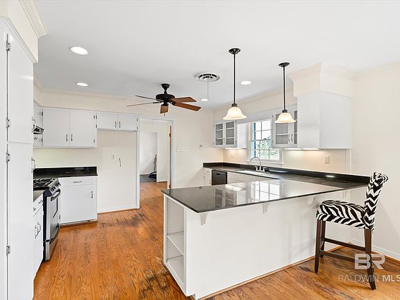 Charming home in the Sky Ranch S.D. Convenient to Government, Cottage Hill and I-65 / I-10. A beauty with so much potential, is all hardwood with tile baths, oversized rooms, lots of light and freshly painted interior. The main focus is the 18' x 25' Great Room featuring cathedral ceiling, fireplace, built-ins, hardwood and leading out to the glassed sunroom that faces a brick water feature in the back yard. Kitchen has granite countertop, eat on bar, gas stove and two pantries. There is a mudroom entry off the carport and a laundry room. The three large bedrooms have the parquet flooring. The backyard is fenced with lots of areas for gardening and landscaping potential with a storage building. Roof is 7 years old. All information provided is deemed reliable but not guaranteed. Buyer or buyer’s agent to verify all information. Buyer to verify all information during due diligence.