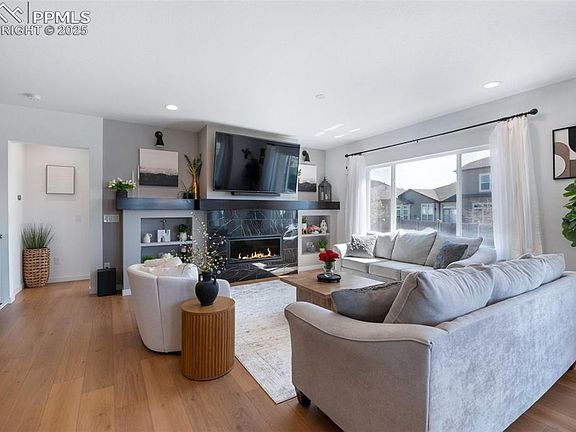 Welcome to this stunning former Classic model home, perfectly situated on a beautifully landscaped corner lot with breathtaking mountain views and a prime location across from open space. This thoughtfully upgraded home offers 4 bedrooms, 3 bathrooms, and a 2-car garage. Inside, the open-concept main level features upgraded light fixtures, modern flooring throughout, and a spacious great room with a cozy fireplace and built-in shelving. The interior showcases a sleek, modern aesthetic with warm tones and stylish black and gold fixtures throughout. Contemporary iron stair railings add a sophisticated finishing touch to the space. The gourmet kitchen is designed for both function and style, featuring charcoal-stained maple cabinets with crown molding, quartz countertops, and premium stainless steel KitchenAid appliances including a gas cooktop. The formal dining area leads to a covered patio, creating a seamless indoor-outdoor living experience. The main-level primary bedroom serves as a relaxing retreat with a walk-in closet and a five-piece bathroom featuring a spa-style shower with a frameless glass door and built-in seat. The finished basement adds even more living space with a large recreation room, a wet bar, two additional bedrooms, a full bath, and plenty of storage space. The backyard is low maintenance and features a large concrete patio, partially covered, where you can relax and take in the breathtaking mountain views. Located in a quiet, friendly neighborhood with convenient access to restaurants, shopping, and more, this home delivers exceptional living in a truly desirable setting.