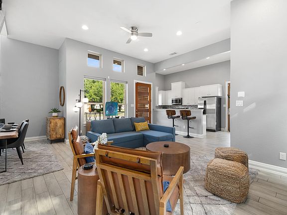 Family room has a large 65" Smart TV, a Queen convertible sofa, 2 ceiling fans, modern leather chairs, and ample seating for your family time or game nights.