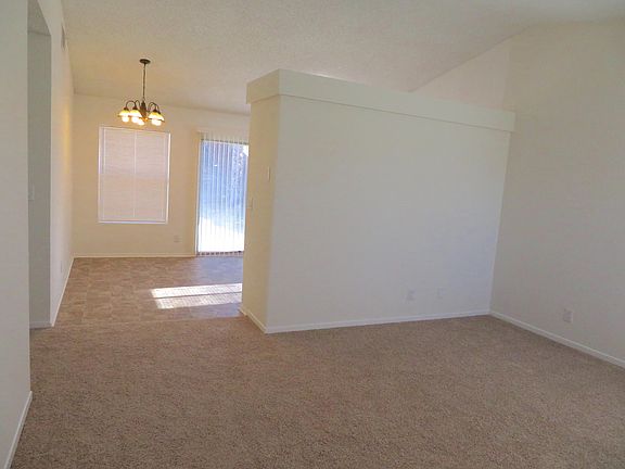Great Starter Home in lovely neighborhood. Towering Palm trees accent both the front and back yards for this home. The security screen door allows for privacy while allowing fresh air and sunshine in. The front opens directly into the Living Room with vaulted ceilings. The dining area is open to the kitchen and can accomodate a generous table. The kitchen has loads of countertops and cabinets for all your cooking needs. There is a sliding door to the backyard. A hallway leads to the bedroom areas and hall bath. There is a large linen and storage closet with bi-fold doors for easy access. The front bedroom is nice and sunny and has views of the street. The second bedroom is across the hall from the first. Both bedrooms have closets with sliding doors. The Master Suite is at the rear of the home and has vaulted ceilings and two generous closets. There is a lovely ceiling fan/light fixture. The private master bath is the perfect spot for a candlelit bubble bath. Down the hall (cont.)