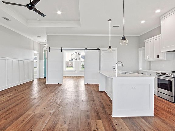 - Breakfast Bar, Crown Molding, Kitchen Island, Pantry, Shelving, Split Bedroom, Walls Wainscoting, Bedroom, Breakfast Room, Dining Room, Kitchen, Living Room, Master Bedroom