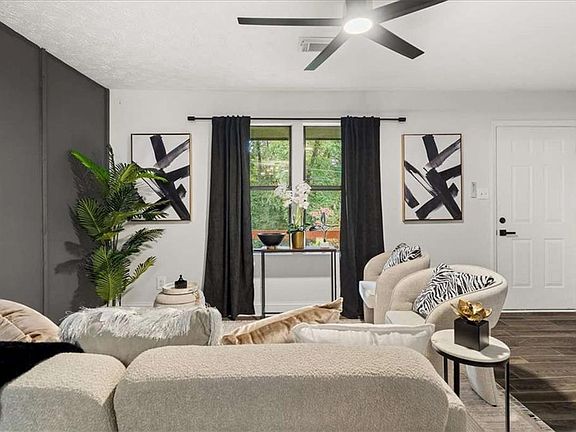 Welcome home to this tastefully renovated Ellenwood residence. A welcoming rocking-chair front porch sets the tone for the thoughtful upgrades found throughout. Inside, you'll find a bright, modern layout with new flooring, fresh interior and exterior paint, updated lighting, and new plumbing fixtures. The kitchen boasts new cabinetry, new stainless steel appliances, quartz countertops with a solid slab backsplash and access to the back patio that is perfect for relaxing and entertaining. Upstairs there are 3 bedrooms including the spacious owners suite. This move-in ready home blends comfort and practicality, perfect for everyday living and entertaining.