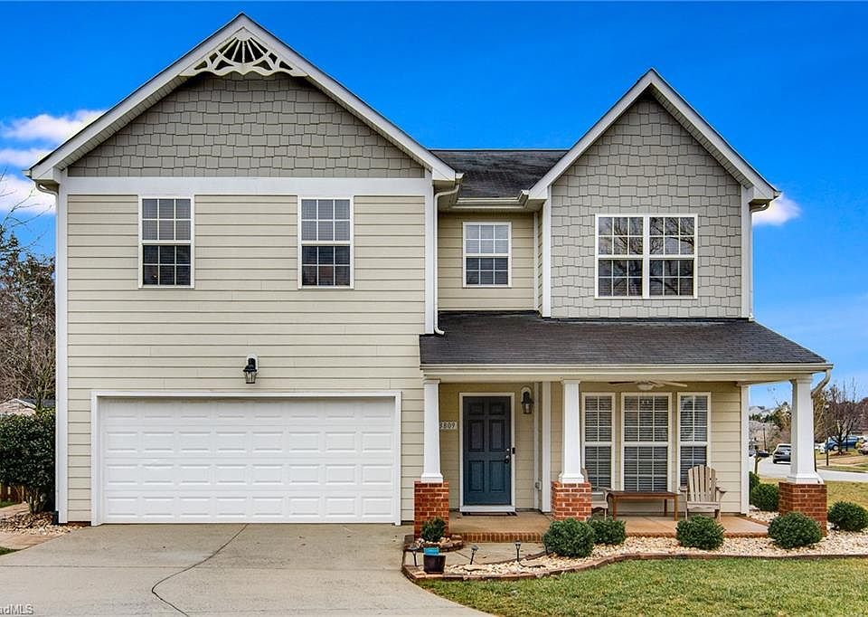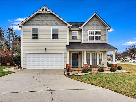 This immaculate 4 Bed 2.5 Bath home with additional loft could be used as an office or playroom. Sits on a corner lot in a cul-de-sac. Main level consists of an open living room/breakfast/kitchen with a formal dining room. Second level consists of a large primary bedroom with bathroom ensuite, 3 additional bedrooms, loft, laundry and full bath. Primary suite features tray ceiling, huge walk-in closet and over-sized bath with tub, dual sink vanity and shower. Walkout onto the stamped concrete patio and backyard area with firepit that is fenced in. Conveniently located to shopping centers, airport, interstates as well as to rest of the Triad area. Neighborhood Pool and tennis to enjoy as well! Schedule today your private showing! Seller is offering $1,500 paint allowance with acceptable offer. See Agent only