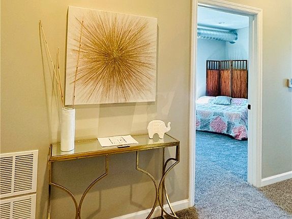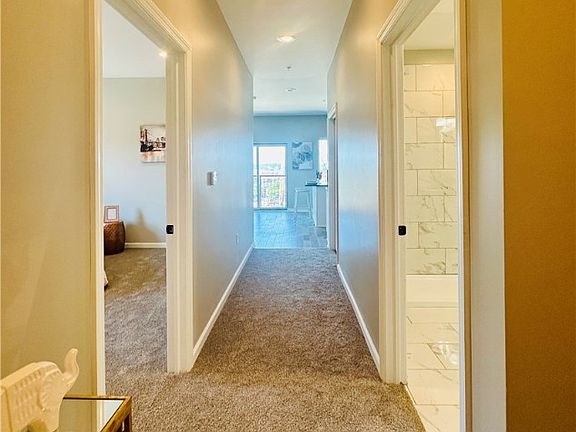 This unit offers practical amenities including a hallway closet, wall-to-wall carpeting in the hallway and bedroom, and a spacious walk-in closet. The bathroom is designed for luxury with a white vanity, a walk-in shower, and stylish white with grey accent marble tile. Recessed lighting throughout adds a touch of sophistication to this beautiful living space. Don't miss the opportunity to make this exceptional home yours!