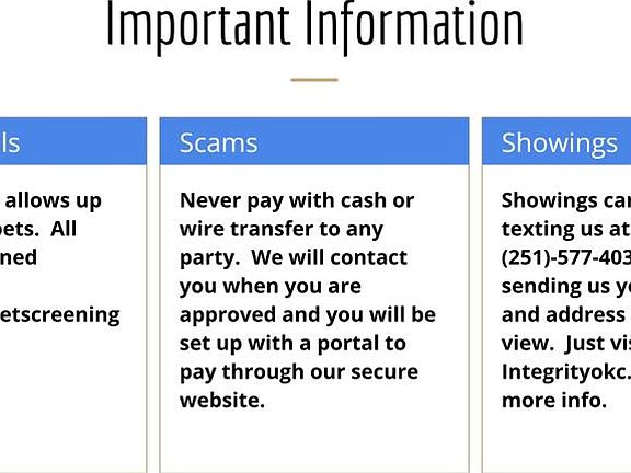 Integrity Oklahoma does not advertise on Craigslist or Facebook. We will never ask you to wire money or pay with gift cards. Please report Fraudulent ads to your Property Manager. The property owner will NEVER contact you to lease or view this home.