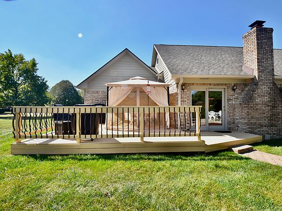 Welcome to this one-level, custom built home in Deer Run. This well built home boasts soaring ceilings, open-concept loft and a split floor plan. The spacious master suite includes cathedral ceiling, a large ensuite w/ walk-in shower, double sinks and a nice sized walk-in closet. This home offers new SS appliances, solid wood floors in the kitchen, brand new gas whole-house generator, brand new furnace, heated garage with epoxy flooring, oversized mini-barn, fresh paint and cedar-backed closets throughout. The backyard is its own oasis which offers a deck, swing enclosed with a pergola and patio area. All of the lots in this neighborhood are half an acre or more. New Palestine has a small town charm with easy access to shopping, and restaurants all within a highly rated school system.