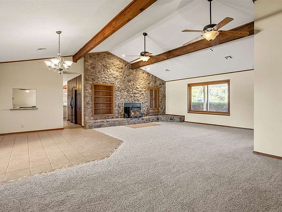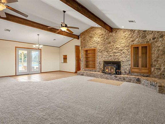 Enjoy country living close to town! This property has so much to offer! The beautiful 3 bedroom, 2 bath home with a pool sits on 10 acres with a shop, pond, and 2 storage buildings. The home has many updates throughout including the remodeled kitchen and bathrooms, new paint, and new carpet in both living areas. The bathrooms have ceramic tile showers and granite countertops with beautiful glass shower doors. The kitchen is a dream with plenty of cabinets for storage and lots of counter space on the beautiful granite countertops. The entry living area has a cathedral ceiling and beautiful rock fireplace. The living area off the kitchen is spacious and was previously used as an entertainment/game/movie room. Enjoy the views outside and the sunshine inside with large windows throughout. Have fun outside with an in-ground pool, basketball court, and a paper shell pecan tree to gather pecans. The three car garage has plenty of work or storage space along with two additional rooms. One room is a cedar closet perfect for storing clothing during season changes. The other room is where you access the in ground storm shelter and you could use this space for an office, craft room, or workout room. Call today to see this great property!