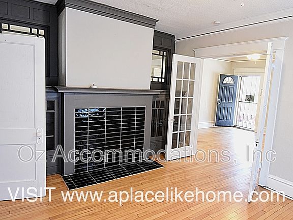 Hardwood floorsClawfoot tubMantle with built-in shelvesFrench doors