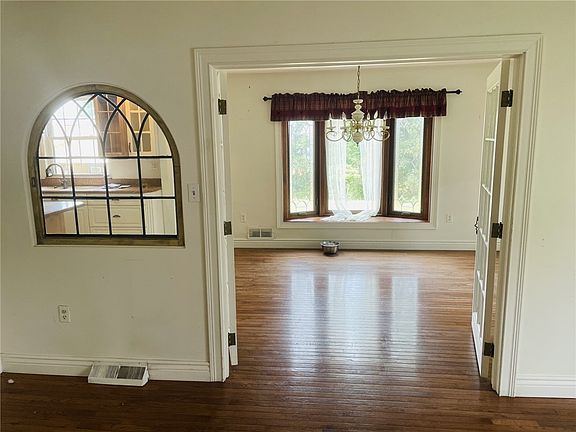 The first floor features an open-concept kitchen and dining area, a spacious living room adorned with bay windows, and a cozy rear sunroom with a gas fireplace. Three beds and one full bath are conveniently located on this level.