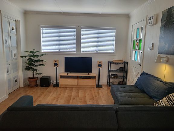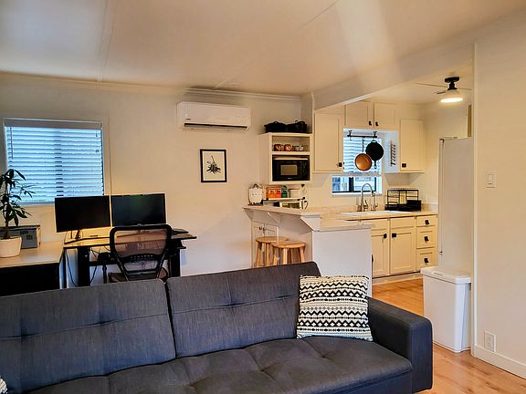 Compact yet complete, the home features a queen bed, full bath, laundry, outdoor dining patio, BBQ grill, and dedicated parking. A comfy couch and TV await after a day of exploring.
