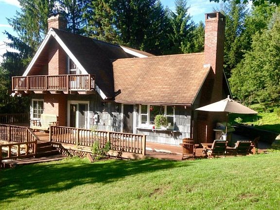 Old World Charm greets you in the WARM AND INVITING HEART of this well cared-for ROXBURY RUN HOME. Friends will want to gather in this gorgeous kitchen, featuring a LARGE BRICK FIREPLACE and SOARING OPEN-BEAMED CEILING. Enjoy the OPEN FLOOR PLAN on main floor and HARDWOOD FLOORS THROUGHOUT. Perfect for INDOOR/OUTDOOR LIVING with HUGE WRAP AROUND DECK. Listen to the babbling of the BACK YARD WATER FEATURE and be instantly relaxed! BEAUTIFUL GARDENS, MEANDERING STONE WALLS, APPLE TREES and a small PEAR ORCHARD on this unusually large Roxbury Run property. A POTTING SHED, BABY BARN and ROLLING LAWN make for an idyllic PRIVATE SETTING among the MATURE TREES. Sellers have kept property energy efficient with NEW WINDOWS. A large SEMI-FINISHED BASEMENT provides space for a pool table, your favorite hobbies or perhaps a small studio or media room. Attached garage has room for your car and your workbench! Property includes membership in Roxbury Run pool and tennis courts club. GREAT LOCATION: Near Roxbury, Margaretville, Farmers Market in Halcottsville as well as skiing, hiking and Roxbury's booming wedding business. House will make for a PERFECT GETAWAY for you, or PICTURE PERFECT AirBnB or VRBO rental when you are away.