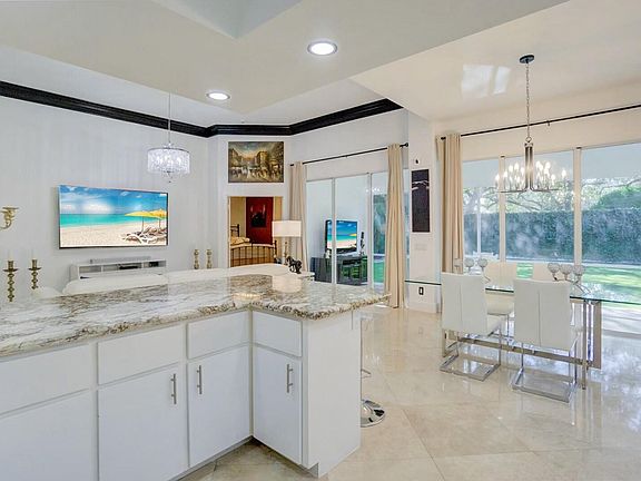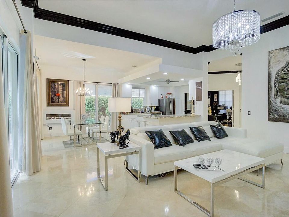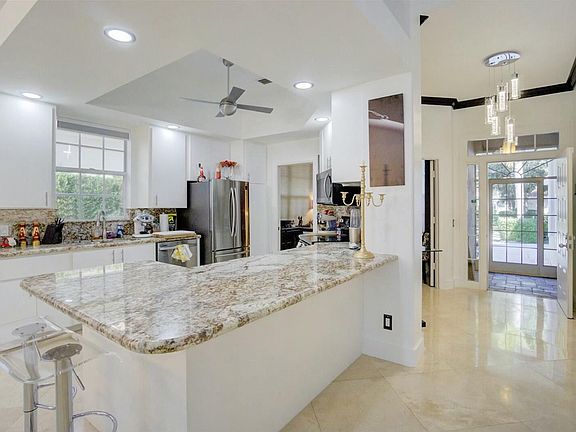 Exquisitely renovated, this 3-bedroom plus den, 2-bathroom home exudes European elegance with clean lines, soaring ceilings, and pristine marble throughout, including in the luxurious bathrooms. Every inch of this meticulously maintained residence reflects unparalleled craftsmanship and attention to detail. The serene screened-in patio overlooks a private, lush artificial turf yard, while the garage features an epoxy-coated floor and a storm-rated hurricane garage door. Enjoy top-of-the-line stainless steel appliances, Italian Massa outdoor tiles, crown moldings, and hurricane-impact sliding doors. The primary bath is a spa-like retreat with a jacuzzi tub and body jet shower. For added peace of mind, the home includes cameras mounted inside and out, ready to connect with an alarm system.