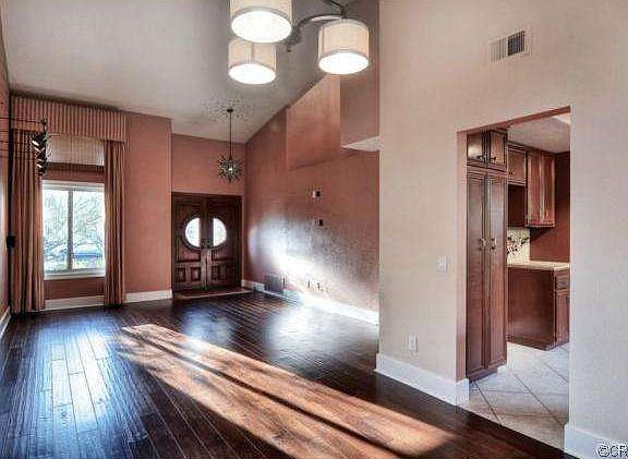 Stunning upgrades both inside and out! This is a beautiful home nestled in desirable Santiago Hills. Each room holds a pleasant surprise starting with the entry into the living/dining area. You are met with soaring 20 ft ceilings, gleaming hard wood floors and custom floor to ceiling window coverings. There are newer double-pane low e windows thru out. The kitchen floods with light from a wall of windows and has S/S appliances and custom concrete counters that wrap through and include a breakfast bar for casual dining. The custom back splash is both unique and lovely. The kitchen opens to the family room with custom fireplace surround, built in book cases, recessed lighting and access to the lush, low maintenance back yard. The staircase is solid walnut with a custom hand rail; look for the hidden storage area as you go up. At the top of the stairs is a hidden treasure, a functional mini office built into the niche. The master suite is sumptuous! Walk in closet, bonus storage area, custom window coverings, extra plush carpeting and imported lighting. The bath is 5 star with high ceiling, heated floor, custom glass enclosure for the beautiful shower, extra deep spa tub w/a TV. and stunning quartz counter vanity with dual sinks..... This home is a must see!