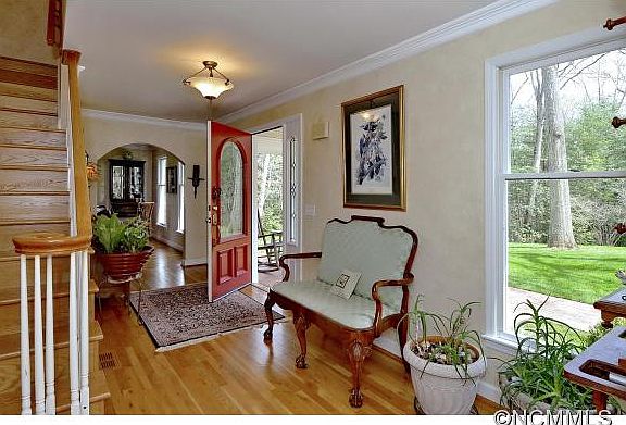 Spacious home on 3+ acres set in coveted enclave w/in Ramble Biltmore Forest gates offers ultimate blend of town & country. Privacy, security & convenience w/out restrictions or dues. Approved survey for subdiv. into 2+ acre lot w/house & separate 1 acre lot (will not sell 1 acre first). Borders green space with delightful creek (Property not in flood zone). Zoned floor plan can live cozy or expand for a crowd. Atrium & Bonus Rm. sq.ft. not incl.