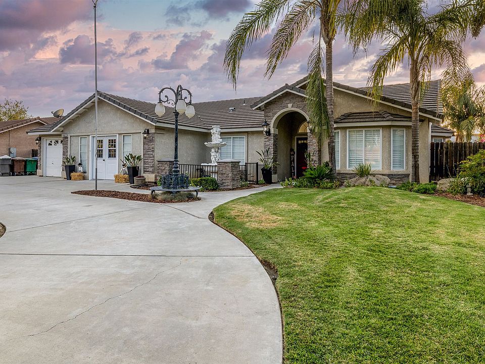 Pride in ownership truly shows in this beautiful 5 bedroom 3 bathroom property. It starts with a grand u-shaped drive way with RV/boat parking. Lovely stone trim and tall double doors as you enter the home. Enjoy a large chandelier and spacious open floor plan from the minute you walk in. This layout features living room with fire place and formal dining/family room. Bathroom has been recently remodeled with tile shower and updated flooring. New white shutters throughout really bring out the elegance of the home. The opportunities are endless with a permitted garage conversion. Imagine your man cave, mother-in-law suite or fifth bedroom with own restroom. Back yard features large covered patio with stamped concrete and lots of space for family fun. Short distance to Kerman High School. Call today for your private showing.