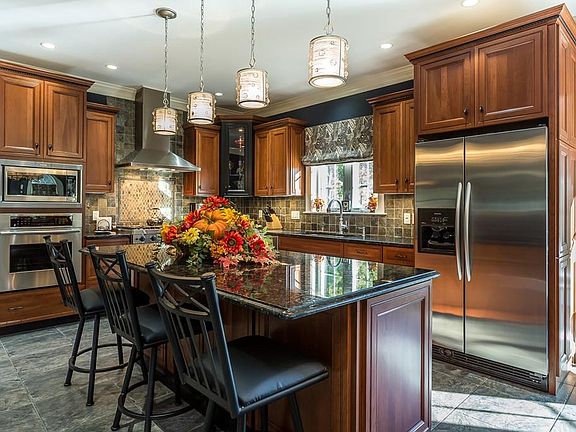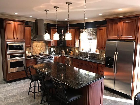 Spectacular custom brick front colonial with 3 car heated garage (9' doors), 4 bedrooms, 3.5 baths/ Gourmet kitchen with Viking stove, Thermador wall oven, granite, under-cabinet lighting, tile backsplash, large island and dinette (seats 8+), open to beautiful family room with built-in cabinetry/wine and beverage frig, gas fireplace and coffered ceiling. The master suite is breathtaking with cathedral ceiling, corner gas fireplace, sitting area, 2 walk-ins and dream bathroom. Lower level with full windows, gorgeous kitchen, private designer bath and patio, large family room and walk-in closet in guest room. Sonos sound system throughout, mudroom with bench/cubbies, hydro-air natural gas heating, central air, 12 zones irrigation, generator hook-up, central vac, alarm, Brazilian Cherry floors, room for pool, composite decking, patios, 14x20 shed, designer colors/decor/woodworking throughout.