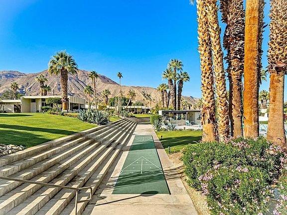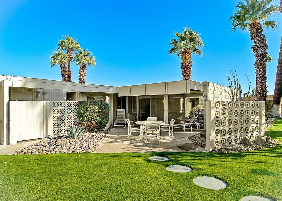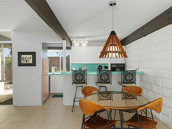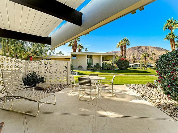 Discover a rare opportunity to own a lovingly preserved mid-century modern gem in Sandpiper's sought-after Circle 3. Designed by renowned architect William Krisel, this 2-bedroom, 2-bath home is a preservationist's dream, showcasing its original 1960 floorplan and features. Every detail exudes timeless elegance, from the authentic kitchen cabinets and appliances to the vintage bathroom tiles and fixtures. The tongue-and-groove wood plank ceilings add warmth and character to the bright, open spaces. This home offers breathtaking mountain views from the spacious main patio and living areas, surrounded by lush landscaping. An enclosed patio off the primary bedroom includes a laundry closet with a full-size stackable washer and dryer and a storage closet with a second refrigerator. A covered carport provides added convenience. The home has a Mills Act contract as a historically designated property, providing significant property tax savings transferable to the new owner. The community features meticulously maintained landscaping, a large saltwater pool, and a beautifully restored central Ramada with a barbecue, refrigerator, and ample seating. Set within a timeless enclave celebrated for its award-winning architecture and landscape design, this home embodies the essence of mid-century modern living. Whether you're drawn to its historic charm or unbeatable location this is an exceptional find. Some furnishings may be available for purchase. Short-term rentals are allowed.