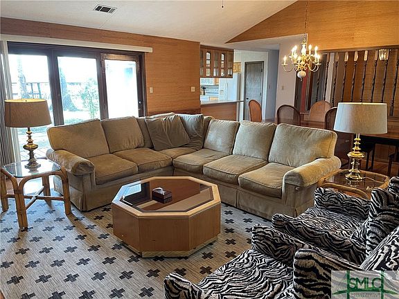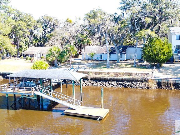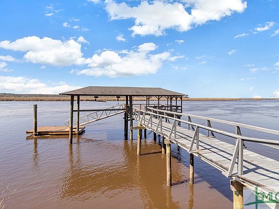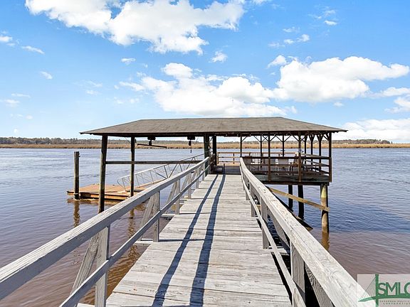 New seawall and dock was refurbished in 2022. Indulge in waterfront living at its finest with this timeless residence boasting awe-inspiring water vistas from every room! Nestled on a half-acre parcel adorned with majestic oak trees, this abode overlooks the tranquil Ogeechee River. Step inside to discover an inviting open floor plan, accentuated by soaring ceilings, wood laminate flooring, ample natural light, and a captivating stone fireplace in the living room. The kitchen offers abundant cabinet space, an eat-in area, breakfast counter, and a convenient walk-in pantry. Retreat to the cozy owner's suite, featuring a sliding door leading to the deck and an en-suite bath with dual vanity, a generously sized jetted tub, and a spacious walk-in closet. Two additional guest bedrooms and a full bath ensure comfort for family and guests. Enjoy your morning coffee on the porch swing. Entertain effortlessly on the expansive covered dock complete with a boat slip.