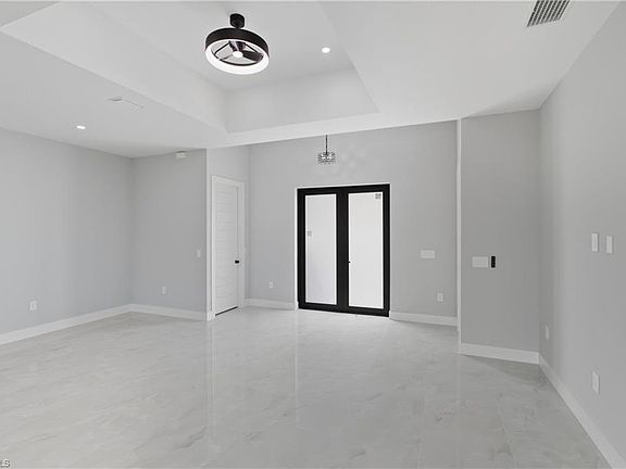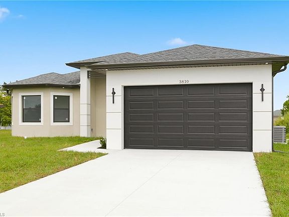Welcome to this CUSTOM (2025) built completed 4 bedroom and 2 bath home. Property is located in the highly desirable SW Lehigh Acres. This grand elevation with flattering frosted double front entrance doors. Home has multiple tray ceilings through out. Impressive oversized porcelain tile throughout, laundry room with vanity sink. Attractive shiplap breakfast bar with quartz rainfall countertops and backsplash, custom soft close kitchen cabinets. Home comes with impact window and doors, epoxy garage and patio floors, with irrigation system. Frosted double door front entrance and rear lanai slider. Stainless steel appliances, custom mirrors, elegant lighting package. Bathrooms have custom showers, with frameless glass enclosures. This property is NOT IN FLOOD ZONE, just minutes to Fort Myers. SELLER IS MOTIVATED AND OFFERING CLOSING COST CONCESSIONS!!