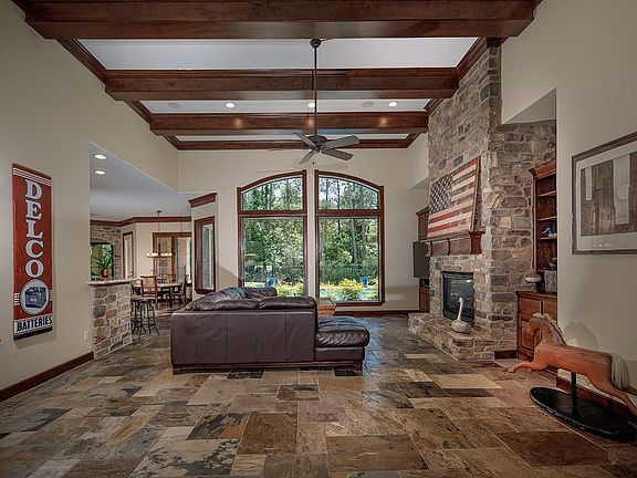 Beautiful custom home on an acre in Benders Landing! Located on a cul-de-sac street with easy access to a lake and park with tennis and basketball courts! Gorgeous stone and stucco front elevation, hardwood and slate flooring, decorative stone accents, and wired for speakers throughout. Formal dining features art niches and crown moulding; open concept island kitchen with breakfast bar, stainless steel appliances, and large pantry overlooks the breakfast nook and den with wood beam ceiling and gas log fireplace; game room is adjacent to the kitchen; owner's retreat down has dual sided fireplace; three bedrooms and 2nd game room up; three car attached garage; pool bath, outdoor shower, covered patio, and wood burning fireplace overlook the sparkling pool and spa.