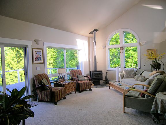 Gorgeous & open one-floor living in a great location w/views of the water. This three bedroom home features a generous master bedroom & spa-like bathroom, vaulted ceilings, two bedrooms & two more baths on the main. Bright & sunny chef's kitchen opens to living room with decks both to the East and West (& off bedrooms too!) You'll enjoy both the sunrise & sunset here~great all day sun! A separate full guest suite, with private entrance has a full bath, bonus room, and many options for it's use.