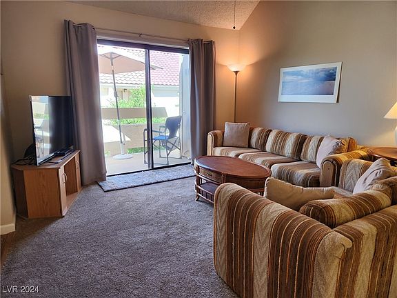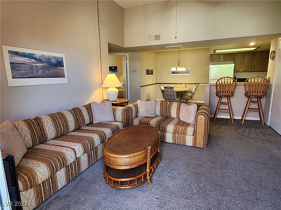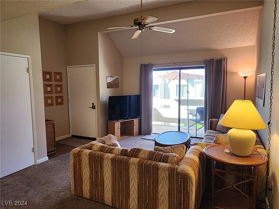 Looking for a winter home or full-time place with Nevada tax benefits and low property taxes? You found it! This meticulously maintained fully furnished, 2 bedrooms 1 bath upper level condo with private detached garage is a gem! Absolutely turn key, just bring your suitcase and bathroom bag and settle in! The original owners have replaced the a/c, water heater, refrigerator, and more. The charming open living area boasts a raised ceiling, balcony access, breakfast bar, designated dining space, laundry closet with stack washer/dryer, and open kitchen with everything you need to whip up a quick meal. Two completely outfitted bedrooms all set for you and your guests. Enjoy the balcony with views of the complex and a glimpse of the river. Situated in popular gated community with four pools, hot tubs and barbeque areas. Available parking for your camping, sand and water toys. Located just minutes from the fun and excitement of Laughlin's casinos, dining options, and the Colorado River.