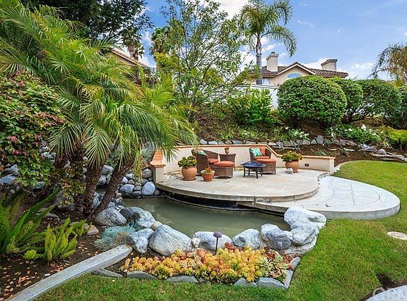The moment you walk through the double doors in this single level home, located on a single loaded street in the coveted community of El Encanto, you will instantly relax. Elegant and airy the home features four bedrooms and 3 bathrooms. The well designed open floor plan maximizes space and creates effortless flow, with a welcoming living room and dining room. The kitchen is a cook's delight with granite counters, custom backsplash, 5 burner gas range, center island, and plenty of counter space to spread out while cooking your family's favorite meal. Snuggle up with a book in the family room while the cozy fireplace crackles nearby. The master suite boasts a walk-in closet with custom organizers, ceiling fan and an inviting fireplace. Step through the elegant french doors to the incredibly private backyard with lush landscaping and a spectacular waterfall and enjoy this tranquil setting. The inside laundry room is expansive and conveniently features a hang rail and sink for handwashing your delicate items. Immaculate 3 car garage with built-in storage has a place for everything. Additionally, residents of El Encanto benefit from the convenient location to nearby hiking trails, spectacular beaches, outlet malls and award-winning schools such as Truman Benedict Elementary and Ayers Middle School.