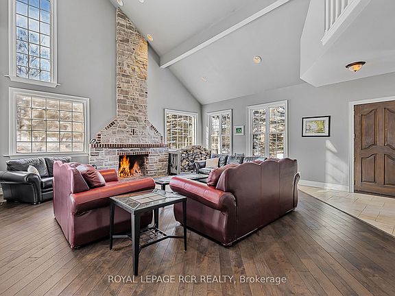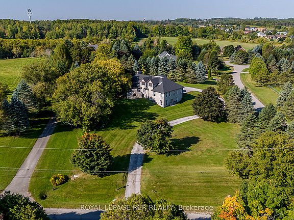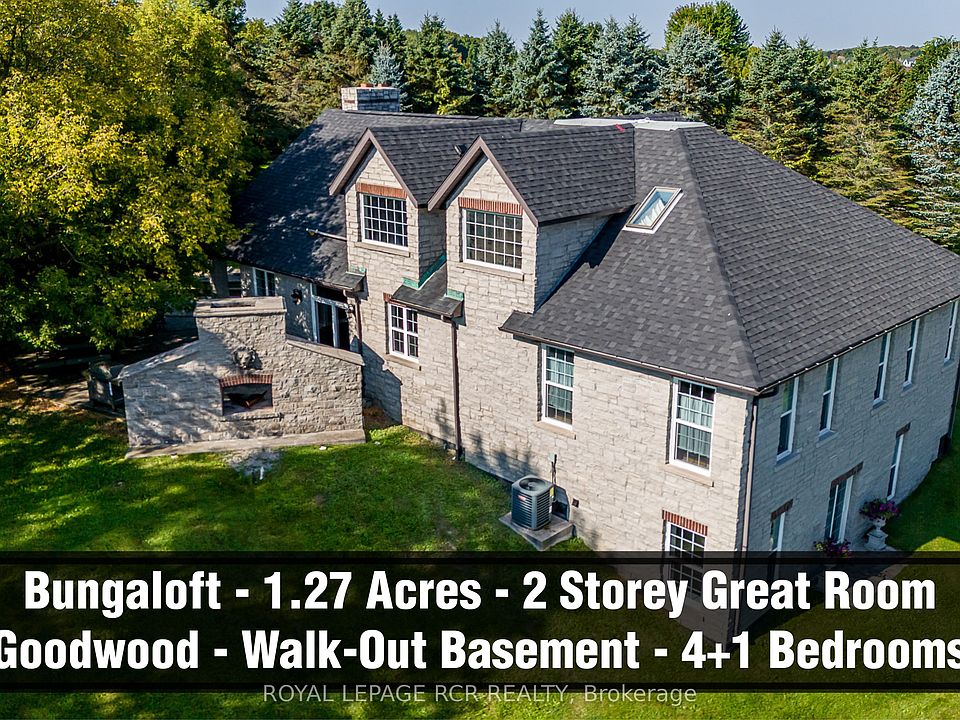 Rare custom-built stone Bungaloft 1.27 private and mature treed acres with a high-elevation and excellent views nestled into a desirable South Goodwood Estate location. Enter into the expansive twenty-foot ceilings in the beautiful great room with a massive hand crafted floor to ceiling stone and brick fireplace. Perfect layout with main floor primary bedroom suite complete with walk-in closet and 5pc ensuite, double sinks and a luxurious soaker tub. The kitchen features stunning light with large windows, travertine floors, stone countertops and amazing storage. The second floor offers three additional bedrooms and another full bathroom. The walk-out basement is perfect for multi family living and offers large completely above grade windows, a separate entrance, a theatre room and a rec room that is big enough for a full-size pool table, a seating area and gas fireplace roughed in. The exterior space is an entertainer's dream with an expansive stone patio, outdoor stone kitchen, fireplace and hot tub, mature tress and relaxing country views.