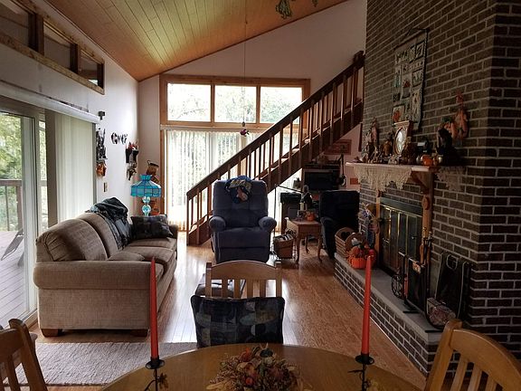Adventures await when you embark on this spacious home with the most amazing copper metal roof. Enjoy lake life at it's finest from your beautifully open, upper deck that wraps around this 3 bedroom, 2 bath house or take in the cool shade of the majestic & mature trees surrounding the property. From the high wooden plank ceilings to the massive wood burning stove with the most ornate handmade mantel, this home of homes will be sure to bring peace and enjoyment; while offering a full finished basement with kitchenette to meet all your family's needs, including a jacuzzi! Lots of natural light and beautiful views will leave you feeling happy to be in your new home.