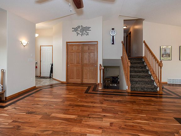 Located in rural NE Bismarck, this property truly is a hidden gem! Nestled in a great neighborhood on just under 2 acres and surrounded by mature trees, this 5 bed / 3 bath multi-level home has so much to offer! Upon entering the main level you will notice the beautiful engineered hardwood flooring throughout the living room and dining room. The kitchen features stainless steel appliances, plenty of cabinet space, breakfast bar seating, and a pantry. Next to the kitchen is a nice sized dining area with access to the HUGE maintenance free deck. Head upstairs to the upper level and you'll find 3 bedrooms, including the primary suite, and a full bath. The primary bedroom features a walk-in closet as well as a ¾ bath with a custom tiled steam shower! Head downstairs passed the main level and you will find a large living room with a gas fireplace and walkout access to the patio area in the backyard. This level also has a non-conforming bedroom, laundry room, and ¾ bath. The lowest level of this home has a bedroom with a walk-in closet, a family room, and access to the utility room with a radon mitigation system. This spacious home also features a heated 3 car garage w/ cabinets included, fully fenced yard, and an additional 20X30 concrete pad within the fence line. You won't want to miss out on this one! Contact your favorite REALTOR® today to schedule a showing.
