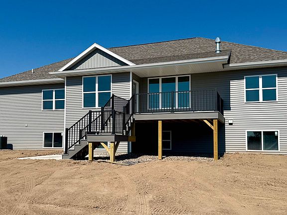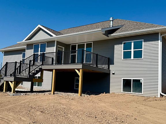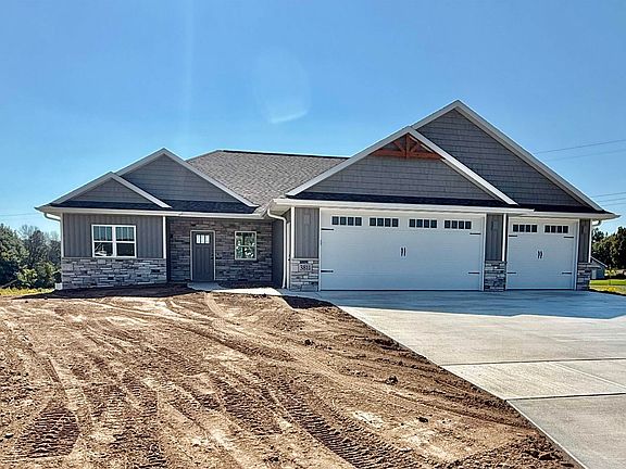 Quality, Focus on Energy, Open concept craftsman style Ranch. Split Bed. Coffered ceiling with wood beams. All no step entries. LVP floors. Granite countertops and lg. island. Walk in pantry. Backsplash tile. Under cabinet lites Step tray in Mast.Bedroom. Lg. walk in closet. Dual sinks mast. bath featuring walk in tile shower. Gas log fireplace with floor to ceiling stone. 9' ceilings. Lg. partially covered deck 12x16 made from PVC composite. Aluminum Rail. Poured concrete patio at bottom of deck steps. 8" floor trusses. 4 lg. exposed windows in lower. Bathroom and 2nd zone heat duct Rough in for future finishing. Electric hybrid hot water heater for energy efficiency. Finished garage, plastered, painted and trimmed. Lg 3/4 acre lot on cul-de-sac backing up to trail. Seeded lawn.