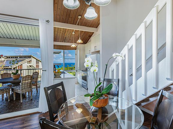 Excellent opportunity to own a thriving vacation rental with stunning ocean and mountain views at popular Cliffs at Princeville. This condo has an impressive 88% occupancy rate for January – May 2025! This top-floor, end-unit condo features floor-to-ceiling windows on three sides, soaring ceilings, and 1,186 SF of bright, open living space.