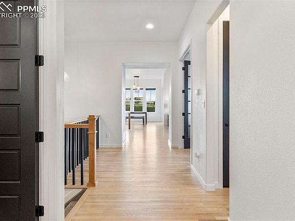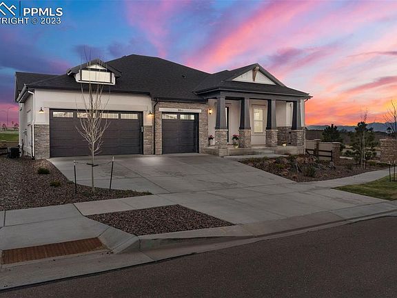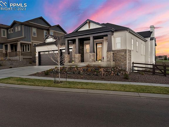 Welcome to this stunning 5-bedroom, 5-bath ranch-style home in the desirable Cordera neighborhood. This property is situated on a spacious lot and offers a comfortable and luxurious living experience. Built in 2020, this contemporary home features a total square footage of 3,784, providing ample space for relaxation and entertainment. Stunning ranch plan in Cordera placed on a corner lot with views and district 20 schools! An open-concept layout and modern, bold finishes throughout. The great room features dramatic charcoal painted elements with spectacular views of Pikes Peak from the large side windows. White oak floors offer a modern and organic feel to the main level. A covered deck offers privacy and views of the community park. The chef's kitchen features an oversized island, walk-in pantry, gas range and a shiplap hood vent. The master suite is a true retreat, offering a luxurious spa-like master bath complete with ceramic tile, a double vanity, a free-standing shower with a rain-head, and a free- standing tub. It is a perfect oasis to unwind after a long day. The 8' barn door is a definite design element that makes a statement. The main level also includes a laundry room, study and junior suite. The basement features a large rec room, three additional bedrooms and two full baths, one of which is an additional en-suite. The three-car garage has plenty of space for vehicles and additional storage. All information deemed reliable but not guaranteed. Buyers to verify.