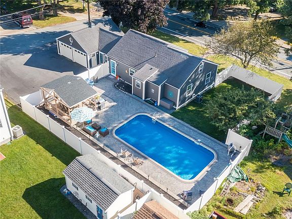 Experience sophisticated living in this stunning Cape nestled on a well-manicured lot in Cumberland Hill. Enjoy the outdoors in complete relaxation with an inground pool surrounded by impressive stone pavers, a fire pit area, and a covered deck perfect for al fresco dining and entertaining. Inside, the home exudes comfort and style, featuring hardwood floors, a sun-filled living room, and a thoughtfully designed kitchen with both counter seating and a creative space-saving dining nook. In between the kitchen and the garage is a quaint & versatile space with attractive slate floors that would be ideal as a mudroom, a quiet home office, or a cozy sitting area. Rounding out the main level are two well-appointed bedrooms and a luxurious bath with a rain shower and double vanity. Upstairs is dedicated to a private bedroom complete with a walk-in closet, while the partially finished lower level offers a family room, half bath, and a bonus bedroom. Additional highlights include a 2-car garage, central AC, convenient gutter guards, and worry-free vinyl siding. This home perfectly blends stylish design with function, and it will not last.