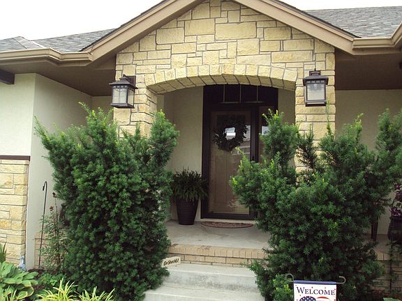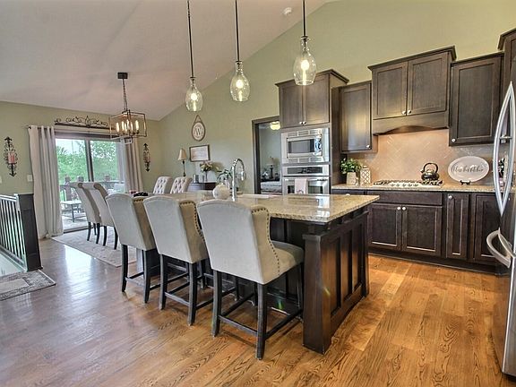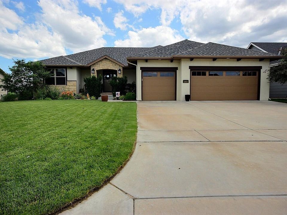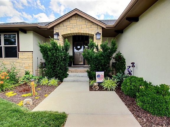 This beautiful modern mission style home built by Moeder Construction in 2016 is located in one of Northwest Wichita's most desirable neighborhoods, "Estancia". This home welcomes you with its beautiful manicured landscaping and its grand stone archway entry. Inside you will be invited into a bright, spacious open living area that feels grand with vaulted ceilings, a gas fireplace, built-in shelves, large picture windows and custom hardwood floors. The kitchen is a cooks dream with soft close cabinets and drawers, solid surface counter tops, a deep porcelain farm sink, a five-burner gas cook top and built in wall oven and microwave unit. Off the kitchen you will find a walk-in pantry with barn door closure and main floor laundry. The primary suite is spacious and has a high tray ceiling with wood beam accents and large windows that overlook the gorgeous outdoor space. The primary bath features a tile shower, large soaking tub, tile floors, quartz counter tops, his and her vanities and with a walk-in closet. The dining area has a sliding door that leads to a covered deck. Here is where you will enjoy the peaceful tranquility that surrounds you as you overlook the sprawling back yard space that is bordered with stunning landscape and backs to an area that showcases natural native grass. This home also has a mid-level walk out that leads to an extended patio space where you can enjoy outdoor dining or long evening chats around a fire pit. The unfinished basement is like an open canvas to an artist. The basement is framed in and the electrical and plumbing access has been established. The basement area offers the option of a large rec./family room, a space for a wet bar, two additional bedrooms and a full bath. This home is stunning, it's a must see. Call today to schedule your private showing.