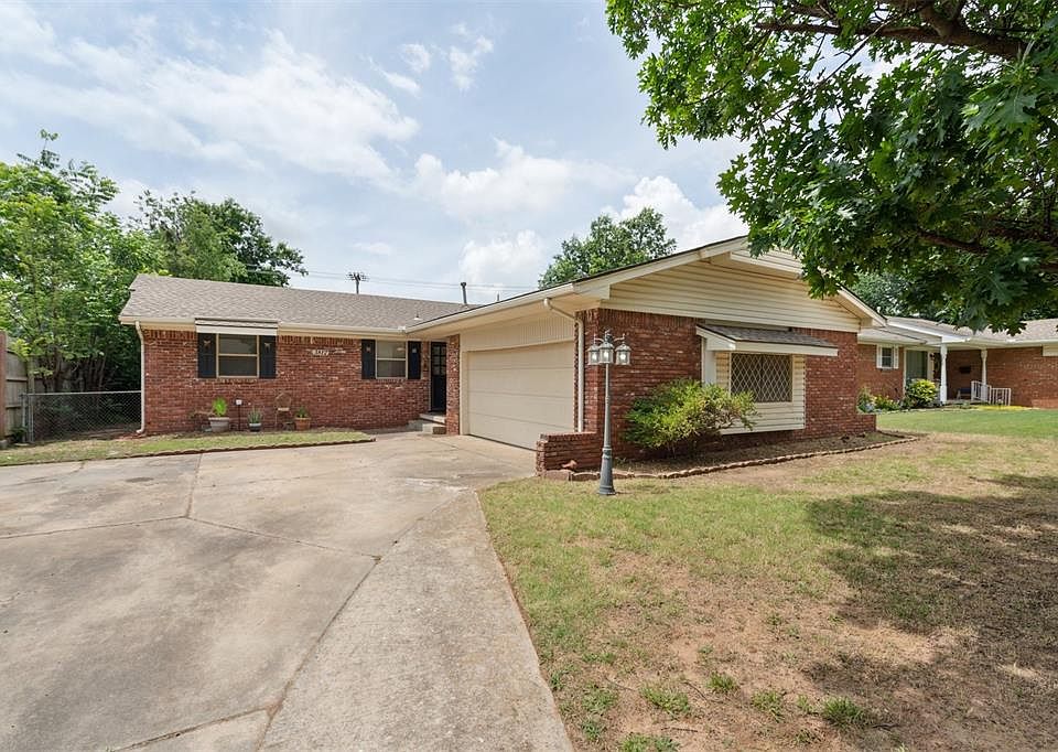 DARLING brick home w/ black shutter detailing, lamp post and Oversized 2 car garage!!!! 3 bed 1.1 bath traditional style home with covered front porch and Freshly painted interior with cute built-ins original to the home. Large picture window in living room overlooking a fenced backyard. Living room and dining room have mid-century knotty pine wall, fireplace, built-in wall hutch in dining room and original wood floors. Kitchen has original knotty pine cabinets, bar opening to dining room, and entry to oversized 2 car garage with laundry hook up. All the windows in this home have beautiful marble window sills! Primary bedroom has nice sized closet and en suite half bath. Two additional bedrooms, original cabinetry for lots of storage and full bathroom in hallway. Storm windows as well as storm doors. Nice big Oak tree in the front yard and quiet street. Enjoy many evenings in this large fenced backyard. Laundry hook up and extra storage in garage. 50 gallon hot water heater! Seller just replaced toilets and serviced HVAC. Great location near hospitals, Mayfair shopping, and easy access to Okc bike trails and Rotary Park and Lake Hefner Parkway/ NW Expressway for easy commute. GREAT INVESTMENT OR FIRST TIME HOME!! Don't let this one get away! MUST SEE what makes this home special! Putnam City Schools