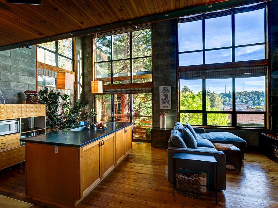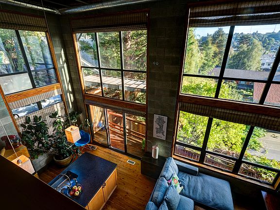 Superb craftsmanship, design & views set this loft apart. Award-winning Johnston architects designed 4 levels of open, light-filled living space. Exposed beams, concrete, steel & top-of-the-line finishes combine for a warm & visually spectacular home. Watch the moon rise through 18-foot high windows, or lounge on one of the 4 balconies. Stroll home past the lush landscapes of a private lane. Garage parking plus plus private surface parking for guests. No HOA fees. Steps to PCC, restaurants, and the Burke Gilman trail. The layout is perfectly suited to a couple who like to host, with a large master bedroom with walk-in closet and balcony on the top floor, and a guest bedroom with full bath and terrace on the bottom floor.