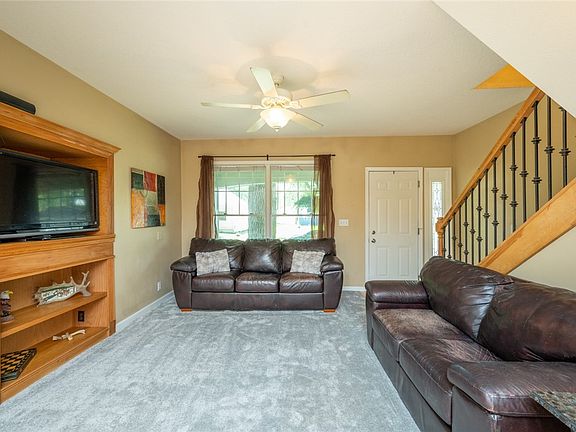 Don’t miss out! Fabulous opportunity with this picture perfect 3 bedroom, 1 ½ bath two story home. This charming home is in wonderful condition and has been meticulously cared for! Highlights include oversized two car detached garage with 220 electric, overhead storage, newer concrete private driveway and parking w/ space for lots of parking, new carpet throughout, covered front porch, mature trees, arched doorways, 6 panel white doors, staircase w/ metal spindles, neutral colors, white trim, executive ceiling texture & first floor laundry. Welcome guests in the spacious entry featuring wood flooring & with full side light. Family room with built in tv niche, shelving & ceiling fan. Oversized dining room with tray ceiling, huge windows and fantastic daylight. First floor bedroom has French doors, ceiling fan and closet, could transition to office, bonus or playroom! Full bath on main floor, new flooring and stackable laundry. The open floorplan continues with spacious kitchen, lots of cabinetry, brand new microwave, electric stone, deep stainless steel sink, black faucet & tile countertops. Convenient back door drop zone/mud room. Upstairs are 2 good sized bedrooms, ceiling fans, lots of closet storage and new carpet! Handy ½ bath upstairs. Lower level is unfinished, perfect for storage! Private yard & quiet neighborhood. Take advantage of Neighborhood Finance Corp $12,500 forgivable loan for closing costs and home improvement funds!