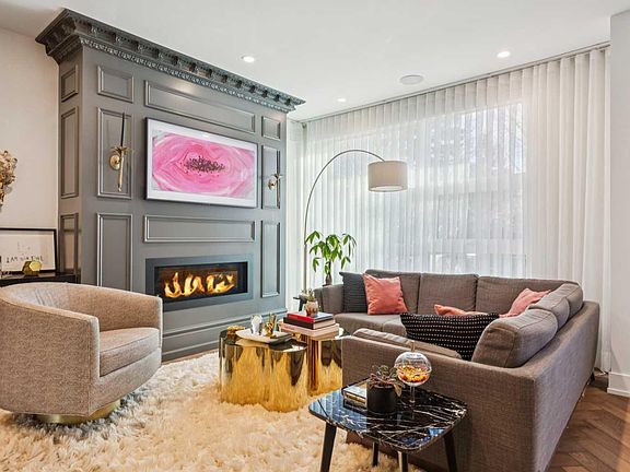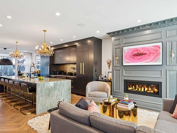 Striking curb appealTotally open-concept main floorHigh ceilingsCustom herringbone hardwood floorsSoft floor-to-ceiling sheersQuartzite countersDiscreet elegant powder room