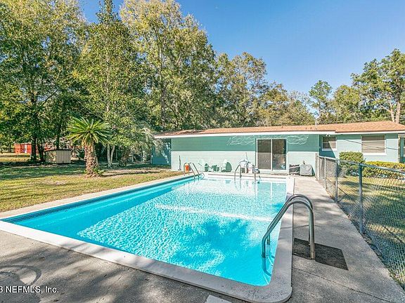 Well built home on just under an acre with a pool! NEW ROOF in December 2022! Fresh exterior paint. Large living room with a fire place and a large slider that leads to a covered patio to enjoy your morning coffee! Newer flooring throughout the main spaces. Utility area just outside the kitchen leading to the pool also includes a half bath and a large room to turn into a shop area or a place for your crafts and hobbies. Enjoy hosting get togethers or quiet time outback with the built in porch swings around the fire pit! So much space and room for potential here and only a short distance from the future First Coast Expressway!
