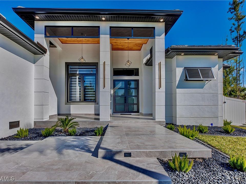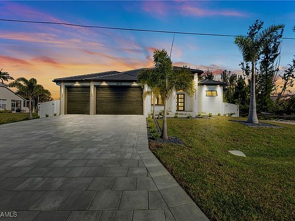 Explore this exquisite 2023-built 4-bedroom, 4-bathroom home featuring a tiled TRIPLE CAR GARAGE and over 2,400 square feet of living space, complete with a SALTWATER POOL and impressive elevations. Situated in the highly sought-after southwest Cape area, this property is connected to city water and sewer (with assessments fully paid) and is conveniently located across from waterfront access and just down the street from the Burnt Store Boat Ramp. The stunning open floor plan showcases multi-level tray ceilings adorned with elegant wood paneling and decorative joists, complemented by specially ordered porcelain tile throughout. The kitchen boasts IMPORTED Italian leathered waterfall stone countertops and backsplash, along with a breakfast and coffee/dry bar. Superior quality illuminated glass display cabinetry includes top-of-the-line DACOR appliances, including an induction cooktop, a contemporary wall oven with steam assist, and an exceptional column refrigerator/freezer.The property is enclosed by a 6-foot privacy fence and beautifully landscaped, featuring a custom-built FULL OUTDOOR KITCHEN equipped with a Bull gas grill, all under a tiled back patio that overlooks the inviting super splash pad pool—perfect for entertaining. Inside, you will find impressively tiled walk-in frame-less glass showers with rainfall jetted shower heads and niches, as well as a desirable soaking tub in the master suite. Spacious illuminated floating vanities with vessel sinks and walk-in closets throughout, complete with high-end organizers, enhance the home's appeal. Additional highlights include a glass-tempered climate-controlled wine rack in the dining area, modern linear vents, recessed lighting, premium pendant fixtures, and refreshing oversized picture frame and casement impact windows. The home features 8-foot single panel doors, frosted glass panel barn doors, expertly finished level 4 walls with no texture, and an accent wall with a built-in electric fireplace. Other amenities include a whole house generator hookup, attractive window treatments, a clever magic faucet and pot filler, irrigation, high-end electric heated commodes, larger insulated 10-foot garage doors, smart car and hub connectivity with a Bose surround sound system, an entire house gutter system, and a remarkable laundry room equipped with a high-efficiency washer and dryer, along with a vanity and custom-built retractable shelving system.This peaceful property is located just minutes from all major amenities. Schedule your showing today!