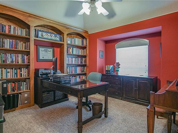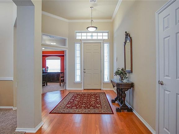 Just Beautiful! 4 bed 2.5 bath in Carrington with a 3 car garage. Large living room with stone fire place, crown molding and built ins opens to kitchen and breakfast area with loads of counter space, built in appliances and pantry adjacent to formal dining. Master suite with sitting area, corner tub, separate shower and large walk in closet. Corridor laundry room with counter and sink leads to deep a 3 car garage with storm shelter. Large North facing patio looks into a large back yard with a water feature. Move in ready with new carpet! Schedule your private showing today.