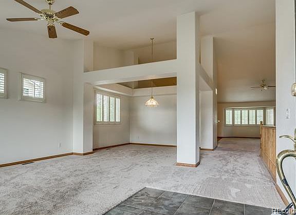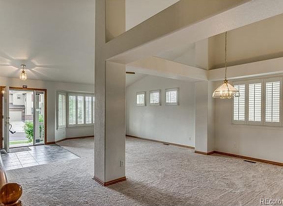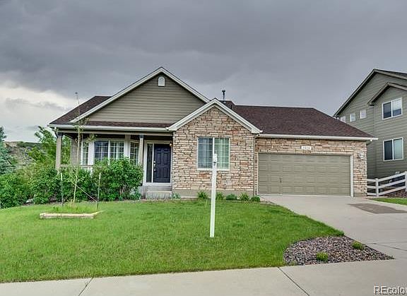 Spacious floor plan in this ranch style home, with kitchen open to great room. The living room with combined dining room has lots of windows for light. Window shutters are included on the main level. Full walkout basement is ready for you to finish your way! New carpet, newly finished hardwood floors in kitchen. From the back deck, you can view open space with Eastern views of hills and meadows. 3 car tandem garage for extra toys. Enjoy quiet living in a community that offers, clubhouse, pool, parks, and trails, yet easy access to I-25.