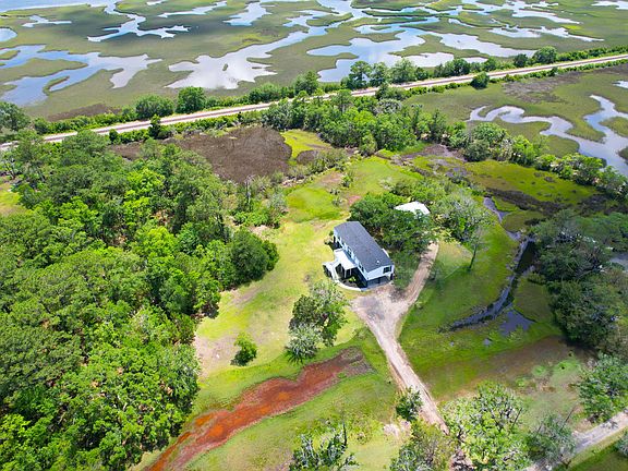 This is a must-see remote property which offers amazing privacy and tranquility while being very accessible to main roads (5 mins to Main Road and Hwy 17). The home has been renovated with all new cabinets, appliances and quartz countertops with a huge kitchen island! It is completely move-in ready! All views from the windows are lush greenery especially from the large kitchen picture window. The primary bedroom sports 2 walk in closets. A brand new HVAC system and new water heater were installed in 2024. The kitchen/living room open area contains a wood burning fireplace and cool modern lighting fixtures/ceiling fans throughout. There is tons of parking under the house as it sits atop 9 ft piers. Enjoy a huge garage that doubles as a workshop, fully powered with 2 huge ceiling fans.