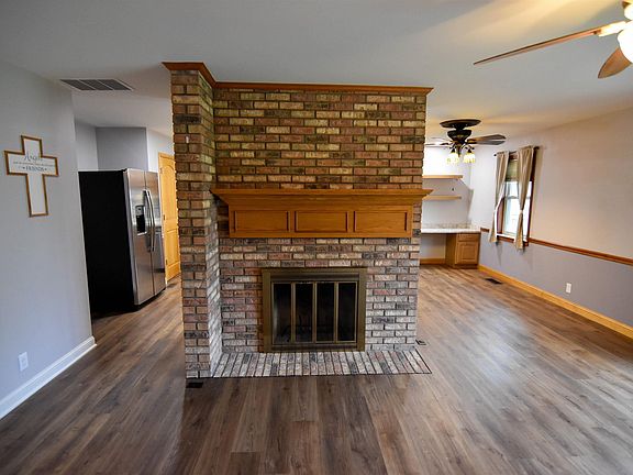Fantastic updated 3-bedroom, 2-bath full brick home on Evansvilles Eastside, conveniently located just minutes from shopping and lots of great restaurants. The open floor plan creates a spacious feel, centered around a beautifully remodeled custom kitchen in 2020, featuring solid maple cabinets with dovetail joints, stainless appliances, a built-in desk, glass tile backsplash, pantry, LVT flooring, and a cute breakfast nook. A unique see-through brick fireplace stylishly separates the kitchen and living area, adding a touch of warmth and charm. The living room, filled with natural light from sliding doors, offers easy access to the backyard, which is small and easy to maintain, perfect for relaxing. The master bedroom is a retreat, boasting a walk-in closet, a second closet, and a full bath with a walk-in shower, single vanity, and tall commode. The additional two bedrooms share a tastefully remodeled hall bath, complete with a tub/shower with tile surrounded, granite countertops, and a custom-built vanity with 3 big drawers for plenty of storage. Additional features include an attached 2-car garage with a utility sink, a quaint yard with a fenced dog run area, storage shed, and great landscaping. Wonderfully updated recent updates include a new garage door, Roof & 6" gutters 2020, windows 2020, kitchen & bath renovations in 2020, A/C estimated 2020 & Furnace approx 10 years per owner. This super cute home is move-in ready, offering comfort and convenience in a prime location.