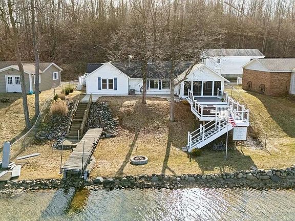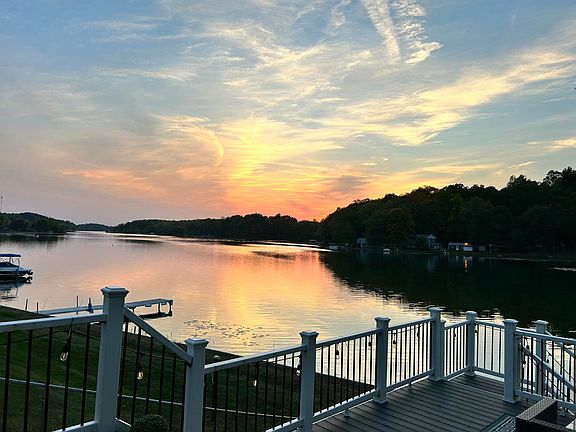 The kitchen features stainless steel appliances, a built-in eat-in area, and ample storage, while the spacious living room offers additional built-in cabinets and plenty of room for gathering. The large fireplace ensures cozy nights after a day on the water, and the sunroom provides stunning year-round lake views—a peaceful retreat for morning coffee or evening sunsets. Step outside to the brand-new, multi-tiered deck, where breathtaking sunrises and sunsets await. Whether you're entertaining guests or unwinding after a day of boating, this expansive outdoor space is truly special.